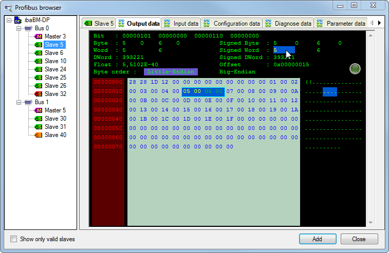 In the upper part of the tab (here, e. g. the Output data tab), the value of a chosen byte sequence is shown – interpreted for different data types – in the bottom part. You can switch between "Big Endian" and "Little Endian". If you have identified the chosen byte sequence as signal value, and want to apply it as measurement signal, mark the correct value in the upper part of the dialog. Then, you can add the signal by clicking on the <Add> button to the signal table in the Sniffer (or “Active slave“) module. Bus number, slave number, I/O, offset and data type are entered automatically. After you have added the signal, the marked choice automatically jumps to the next value of the same data type. You can also transfer a signal to the signal table by double clicking on the correct value.