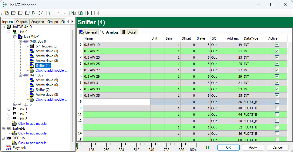 You can use the Profibus Browser for choosing analog and digital signals for a “Sniffer“ or “Active slave“ module.