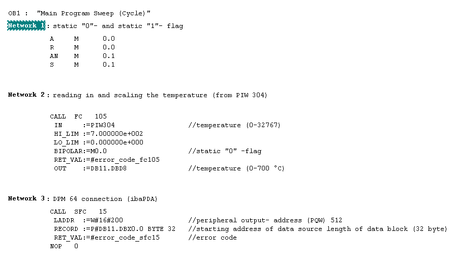 An analog value (e. g. a temperature scaled with FC105 from S7 standard library) is to be transferred as a REAL variable from S7-PLC to ibaBM-DP and acquired with ibaPDA.