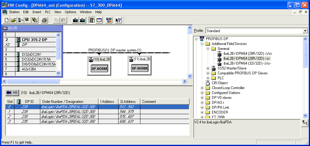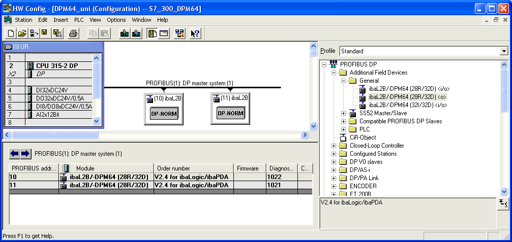 Connect an “ibaDPM64” module with the PROFIBUS line per drag & drop and set an DP address (in the example 10) for this module.