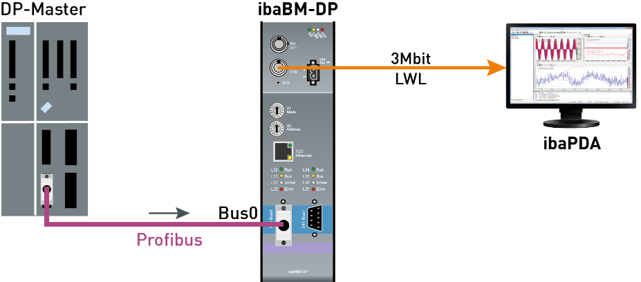 Connect the FO output (TX) on the ibaBM-DP with a FO input on the ibaFOB card in the ibaPDA computer.