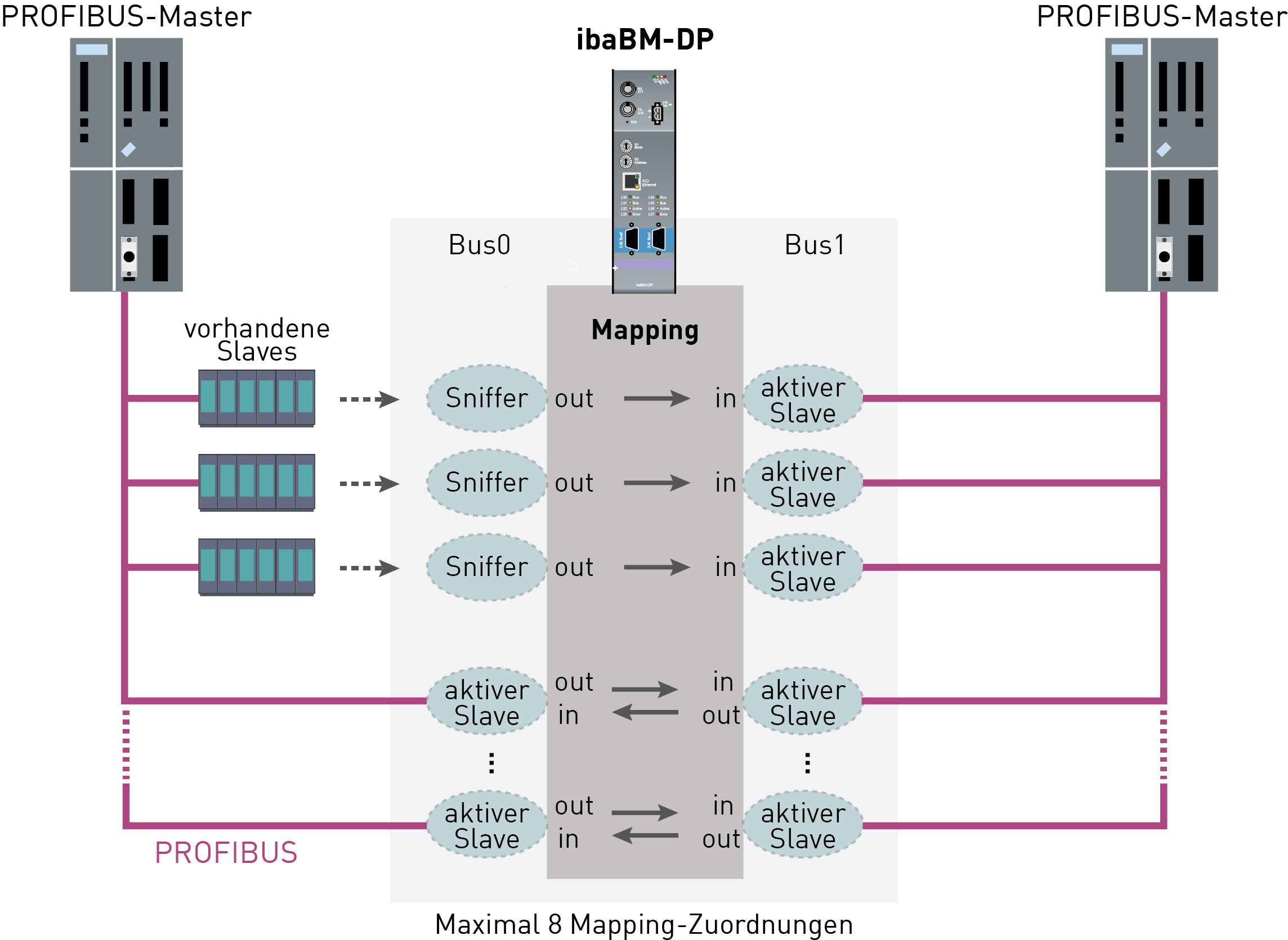 Zusätzlich sind im Beispiel reale externe Slaves im PROFIBUS-System auf Bus0 vorhanden (z. B. Remote IO Stationen, Antriebe etc.). Die Ausgangsdaten, welche der Master an diese Slaves schickt, können mitgehört (sniffen) und auf den Eingangsdatenbereich eines zugeordneten aktiven Slaves auf Bus1 gemappt werden. Das Sniffen von vorhandenen Slaves ist nur auf Bus0 möglich.