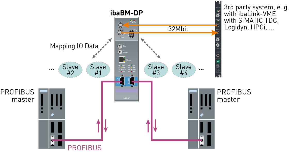 The P2P mode (peer-to-peer) enables a bidirectional system interconnection via PROFIBUS with iba devices with an ibaNet 32Mbit interface (e. g. via ibaLink-VME to VME-based control systems).