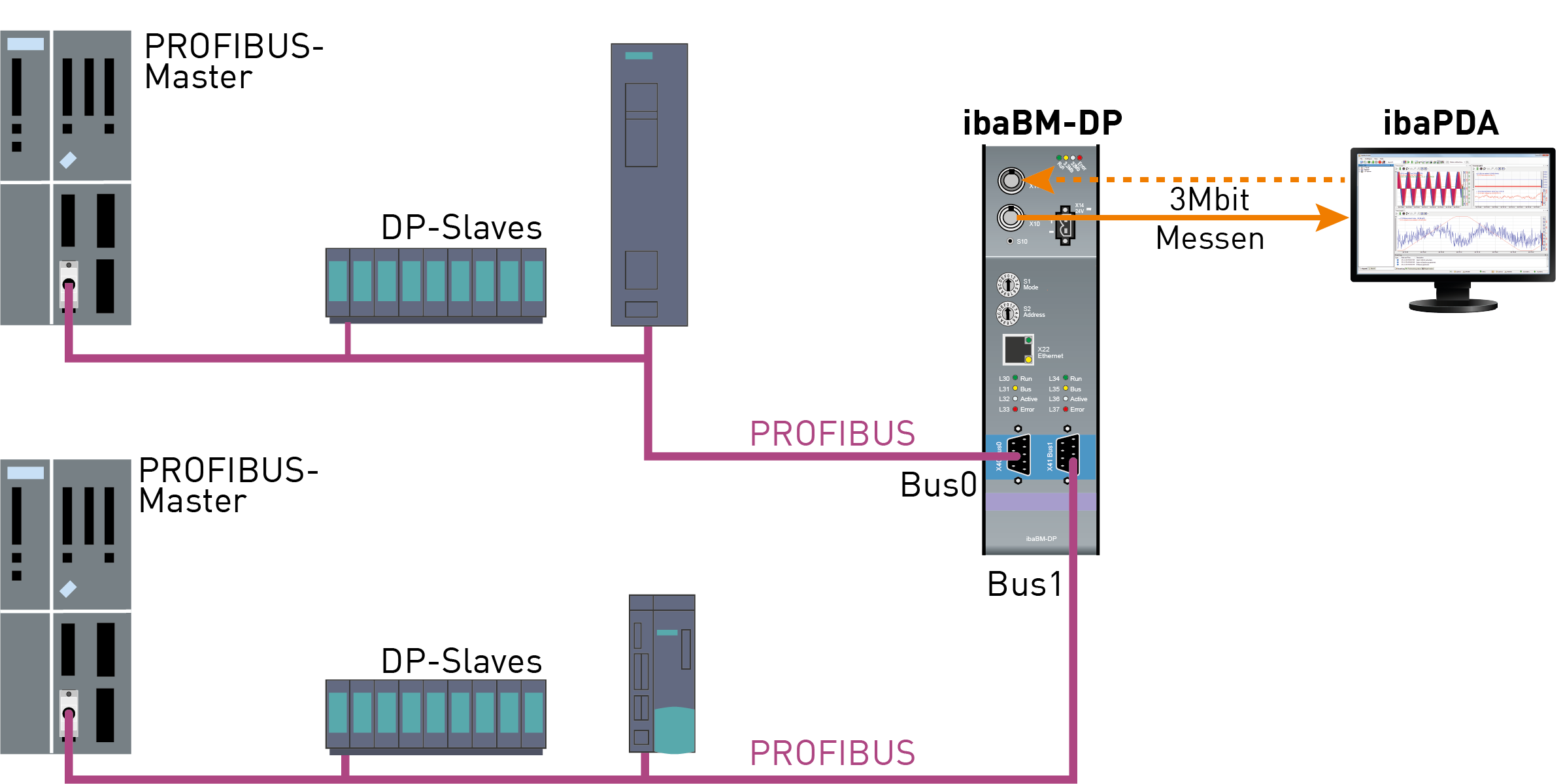 Im Kompatibilitätsmodus 3Mbit können zwei Slaves auf dem Gerät ibaBM-DP eingerichtet werden. Die Konfiguration der Slaves erfolgt über die Web-Dialoge des ibaBM-DP.