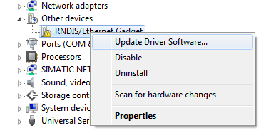 Windows 7: "RNDIS/Ethernet Gadget" under "Other devices"