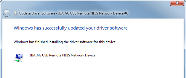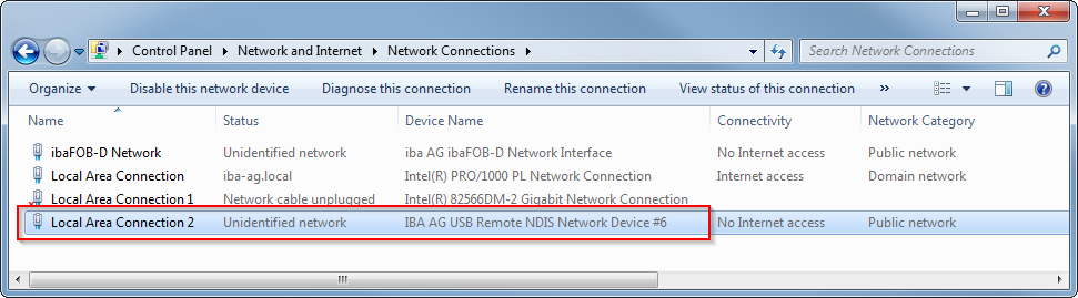 If there are connection problems, the IP address allocation with DHCP may not work properly. If this is the case, assign manually an IP address to the new network adapter "IBA AG USB Remote NDIS Network Device".