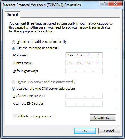 Select Use the following IP address and enter an address in the IP address field which belongs to the same subnet like the fixed IP 192.168.0.1 of the USB interface of ibaBM-DP. This can be e. g. the address "192.168.0.2". Under "Subnet mask", you have to enter "255.255.255.0".