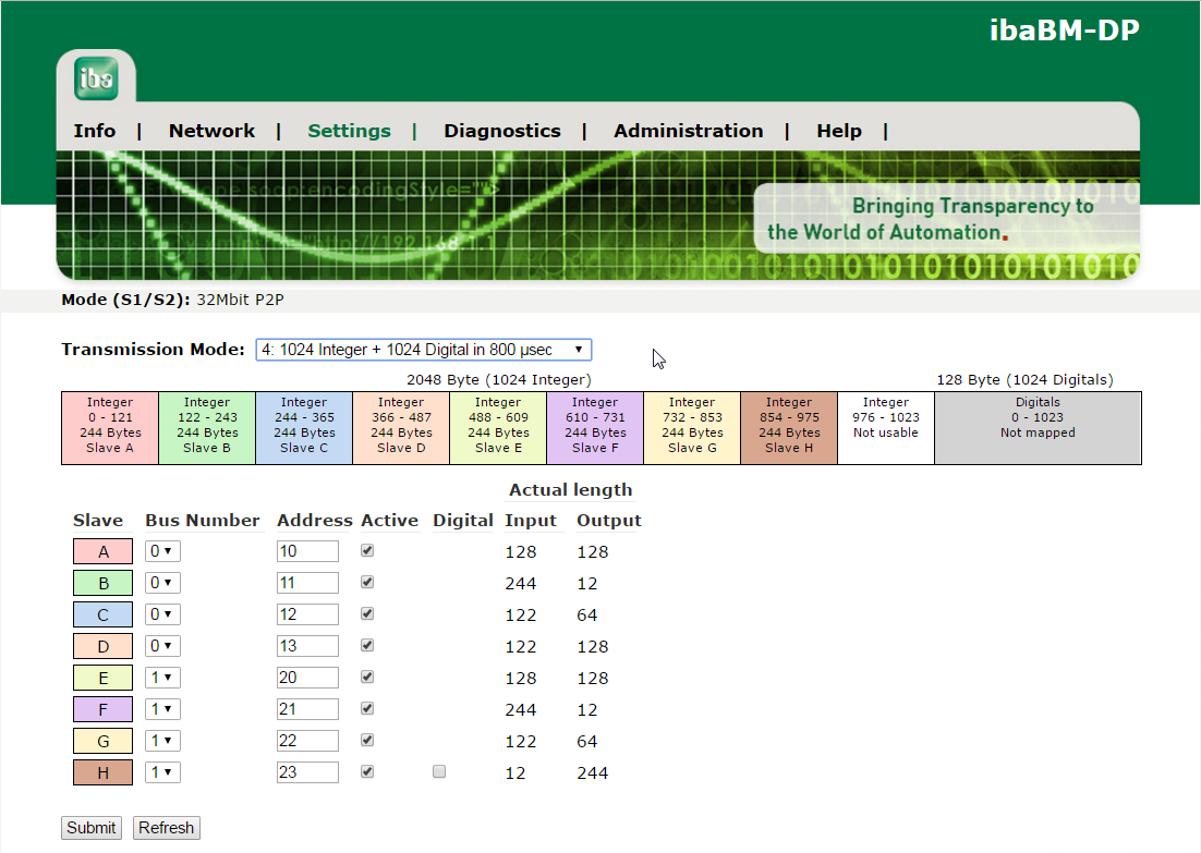 Die Daten aus dem ibaNet-Telegrammen werden in Sende- und Empfangsrichtung auf bis zu 8 Slaves (A – H) abgebildet. Für jeden Slave kann festgelegt werden, auf welchem Bus er aktiviert werden soll, welche PROFIBUS-Adresse er haben soll und ob er generell verwendet werden soll.