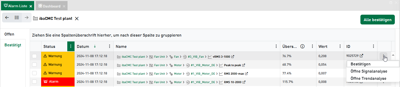 Wenn Sie einzelne Alarme quittieren wollen, klicken Sie auf das Kontextmenü am Ende der Alarmzeile und wählen Bestätigen.