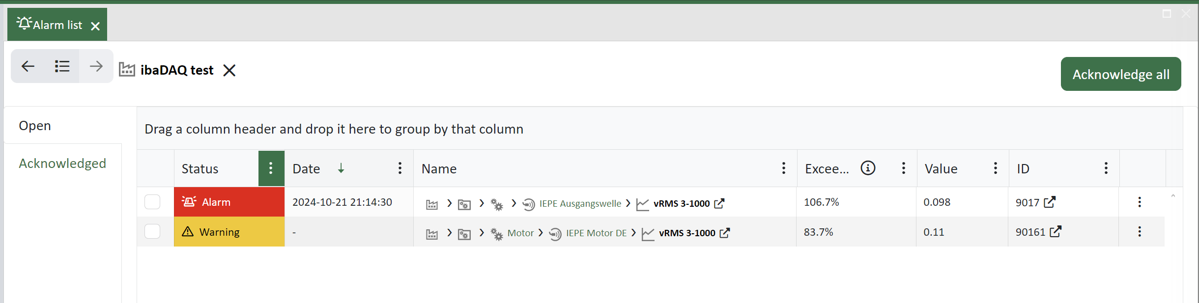 By clicking on the button <Acknowledge all> above the alarm list you can acknowledge all alarms at once. The alarms are then moved to the Acknowledged tab.