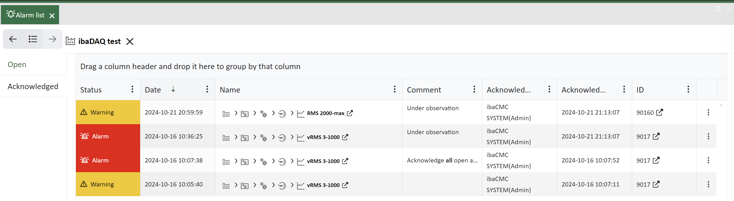If you acknowledge alarms, they are moved to the Acknowledge tab.