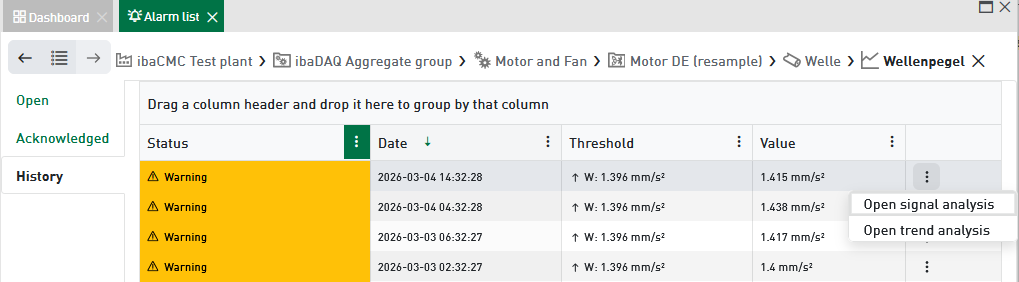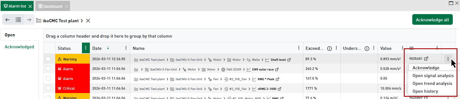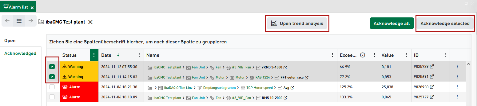 Here, you can select specific alarms to either acknowledge them or open the trend analysis of the corresponding item.