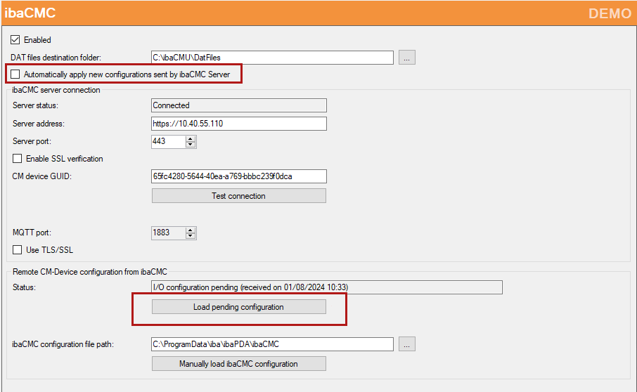 If you disable this option, the button <Load pending configuration> in the Remote CM-Device configuration from ibaCMC area below will become available, in case there is a configuration still pending. The configuration will only be loaded, if you press this button first, followed by <OK> or <Apply>.