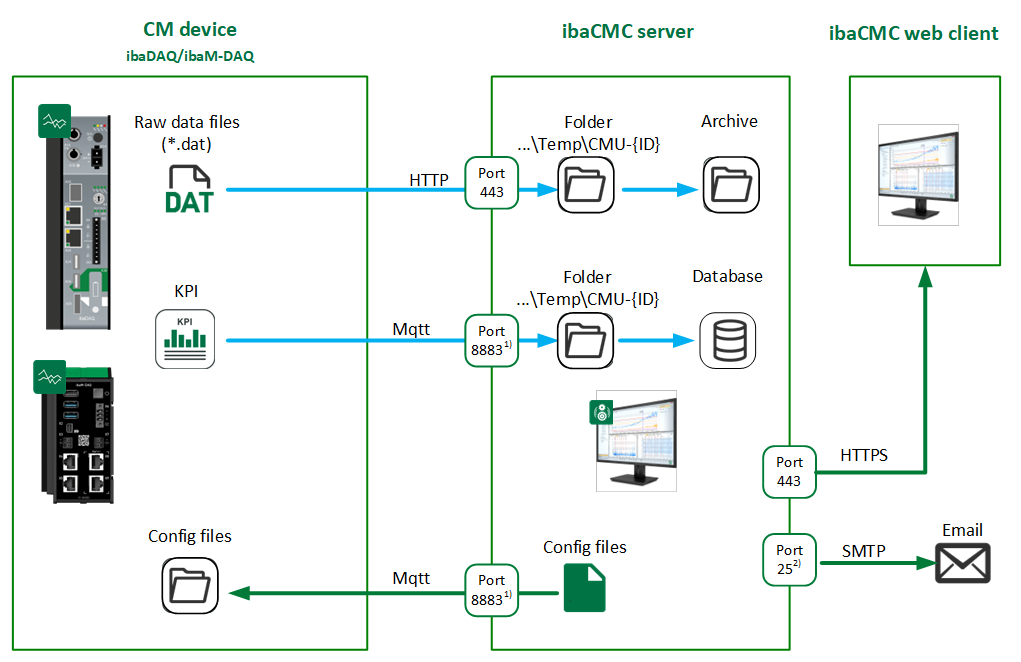 The following figure shows the essential data exchange between ibaCMC and the CM device (CMU). Further below, you'll find information about the ports opened and used by ibaCMC.