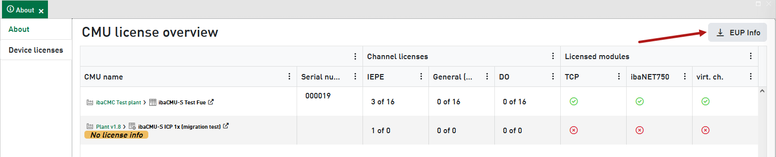 In this tab, you’ll find detailed information about the licenses of the CMU devices in your plant tree.