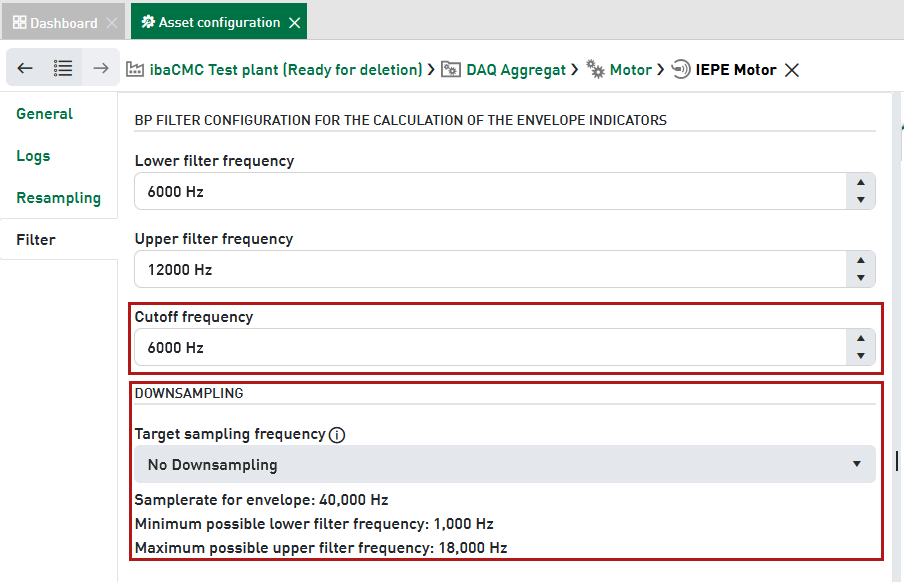 Downsampling optionThis option was created to enable the monitoring of low running machines as well as fast signals in the same CM device. By means of the downsampling you can select a different sampling rate for the envelope spectrum, in order to define lower filter frequencies.
