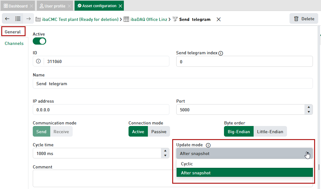 The Update mode setting has been added to the configuration of TCP send telegrams. You can choose between After snapshot and Cyclic.