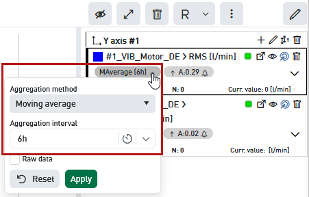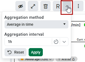 The legend of the trend analysis shows two controls for indicating aggregation method and interval as well as displaying the alarm limit (if configured).