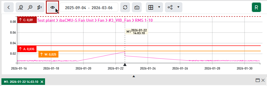 The display of threshold levels, which are defined in a trend analysis can be toggled in the trend chart of the signal analysis. Moreover, the trend graph can be zoomed to the threshold range to make sure that all threshold lines are visible.