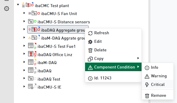 The status of a component can be set directly in the plant tree via the context menu. Depending on the status, a small icon is then displayed in the plant tree. This allows conspicuous plant components to be marked so that they can be quickly found again during later analyses.