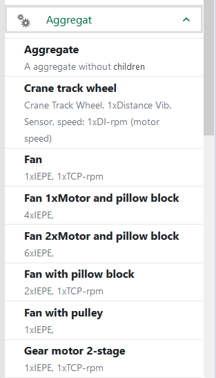 Beispiele für ein Aggregat wären z. B. ein Getriebe oder ein Motor. Nach Auswahl eines Aggregats aus der Bibliothek, das dem realen Aggregat am nächsten kommt, kann es per Drag & Drop auf die gewünschte Aggregatgruppe im Anlagenbaum gezogen werden.