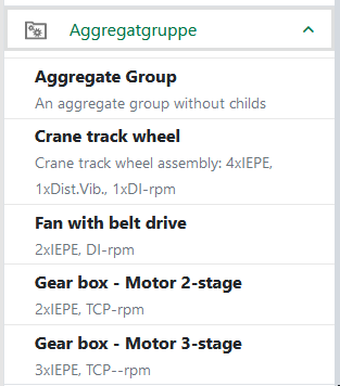 Sie können entweder eine leere Schablone namens Aggregate Group verwenden, oder eine, die bereits Daten enthält, wie z. B. Gear box - Motor 2-stage. Generell ist es immer günstig, die Vorlage auszuwählen, die möglichst nahe an der realen Konfiguration liegt, damit der Anpassungsaufwand möglichst gering ist.