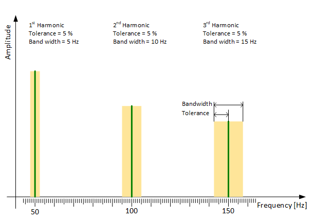 In this example the tolerance is 5 % for the fundamental and the next two harmonics. Consequently, the band width in Hz increases by rising frequencies.