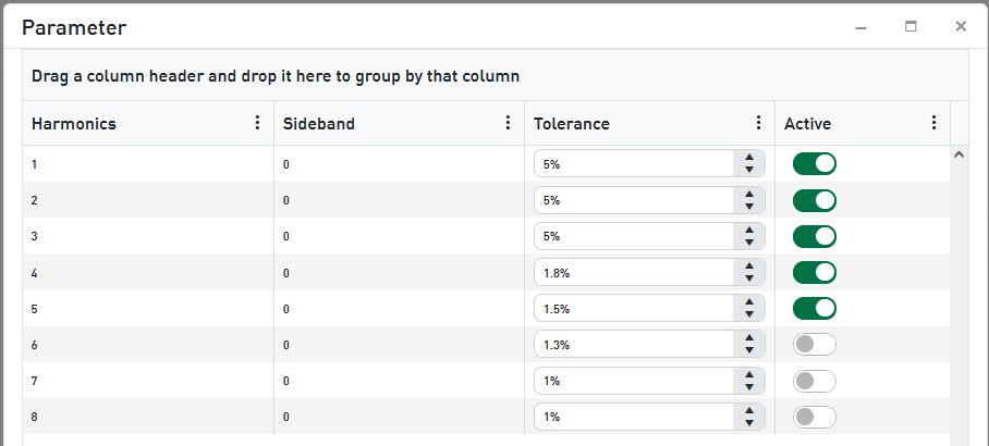 On the ENV inner race harmonics tab you can use this dialog to set up tolerances for the 1st to 8th harmonics in order to define a band width to be searched for the calculated value, e. g. the maximum.