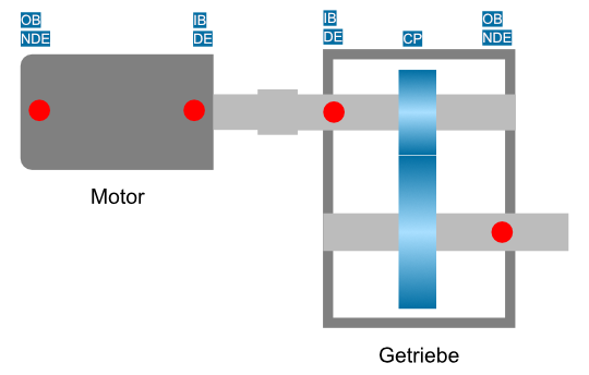 Drive End [DE] / Inboard [IB]: Bezeichnet die Seite, an der die Last abgegriffen bzw. eingeleitet wird. Bei Motoren entspricht dies der A-Seite, während es bei Getrieben die Seite der Eingangswelle ist, über die die Last in das Getriebe eingebracht wird.