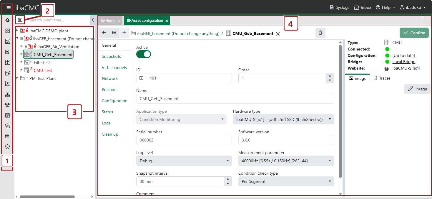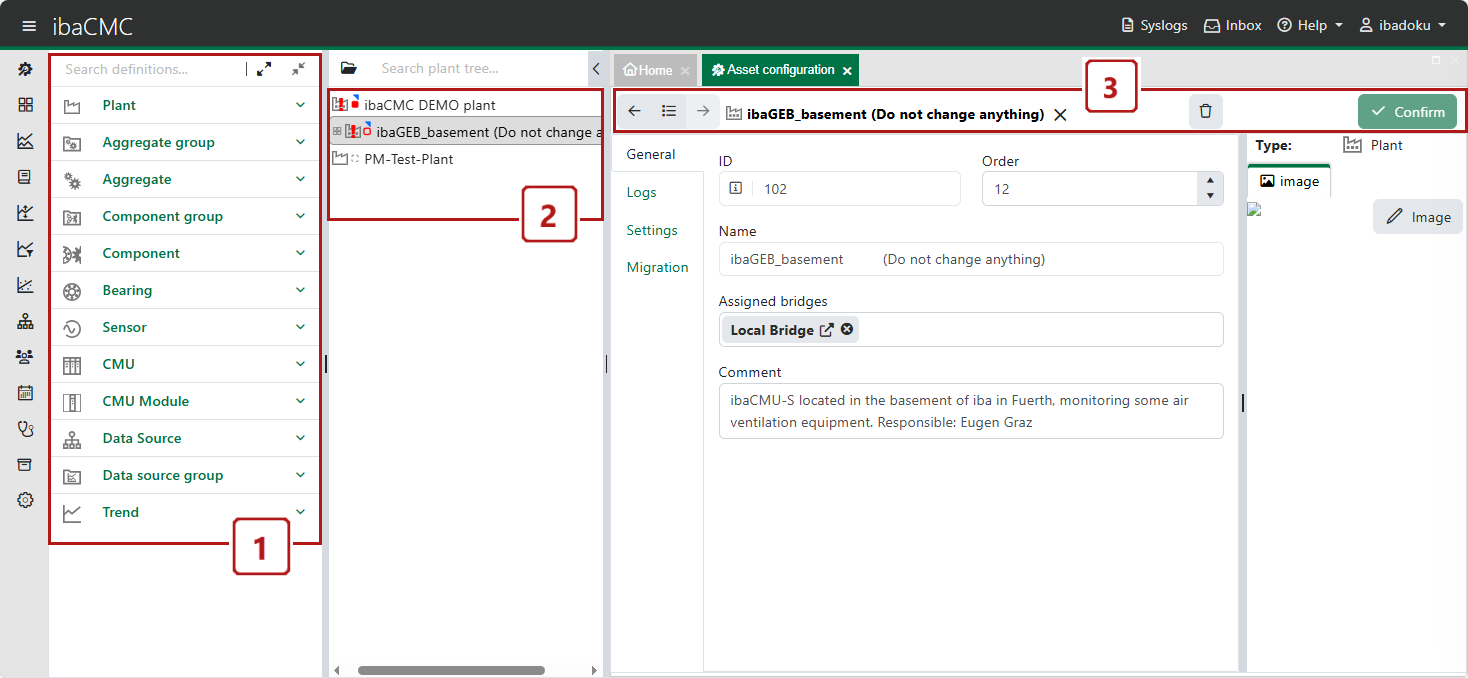 The plant configuration is one of the central features and, in many cases, the starting point for all activities. It is opened by selecting Asset configuration in the menu.