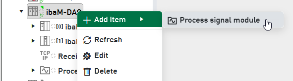 To add a process signal module make a right-click on the CM device (ibaDAQ or ibaM-DAQ) in the plant tree and select Add item - Process signal module.