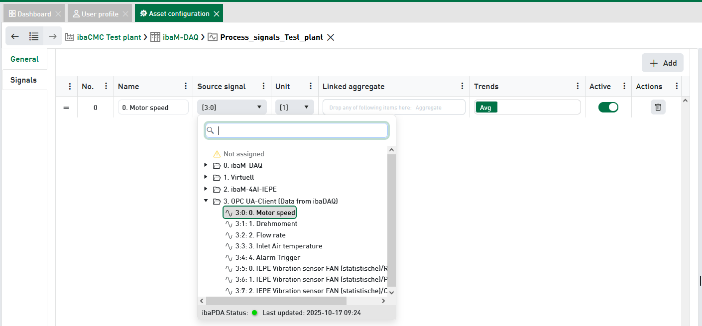If the I/O configuration, i.e. the signal tree changes on ibaPDA side, the source signal tree in ibaCMC will change accordingly. You just have to open the process signal module in the asset configuration again.