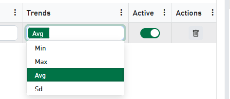 The average trend is pre-configured by default for each process signal. However, you can add more trends, such as minimum, maximum and standard deviation in the trend column.