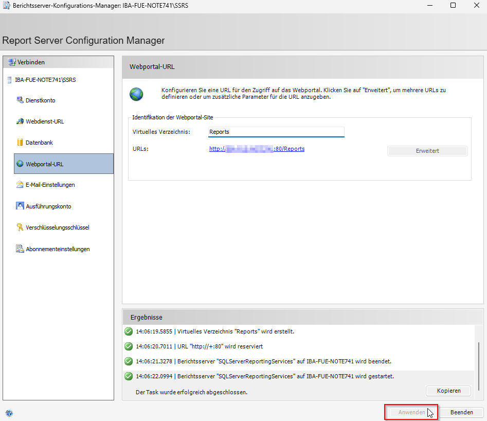 Wählen Sie Webportal-URL im Navigationsmenü, um den Zugriff über das Webportal einzurichten. Tragen Sie hier die Webportal-URL ein und klicken Sie auf <Anwenden>. Über das Webportal können Sie später den Report konfigurieren.