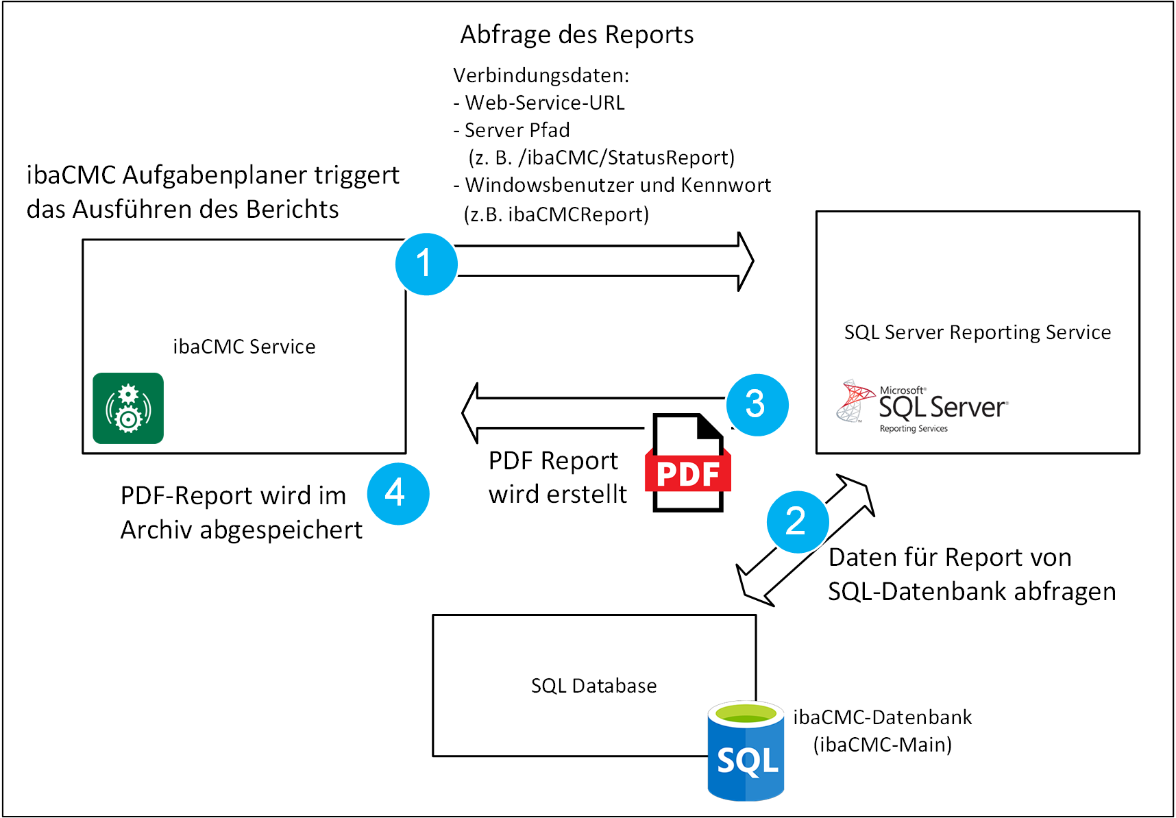 Die Abbildung oben zeigt den Ablauf der Reporterzeugung, angefangen beim Trigger durch den Aufgabenplaner (1), über den Abruf der Daten aus der ibaCMC-DB (2), das Erstellen des PDF-Reports vom SQL Reporting Service (3) bis hin zur Ablage im Archiv von ibaCMC (4).