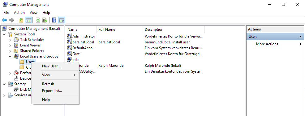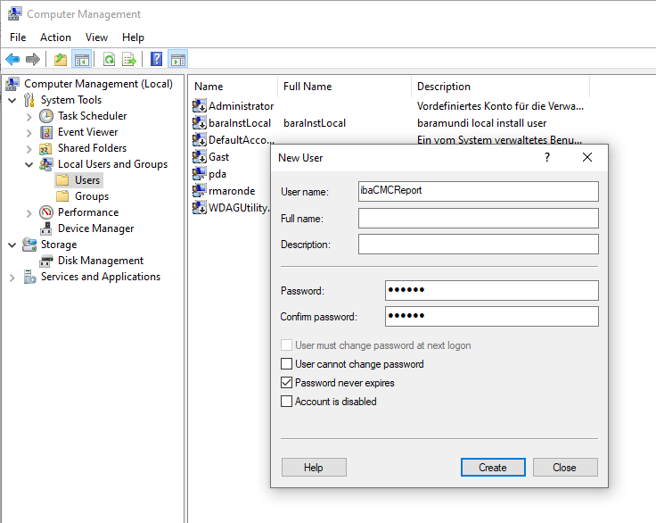 Open the Windows Computer Management and add a new user on the computer. Admin rights on the system are not required for this user. It is sufficient if the user is member of the user group “User”.