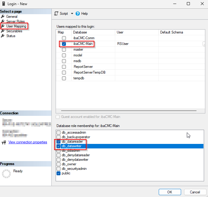 Wählen Sie im oberen Teil des Dialogs, in der Spalte Map, die Zeile mit der Datenbank ibaCMC-Main aus. In der Spalte User erscheint automatisch der zuvor angelegte Benutzername (hier RSUser).