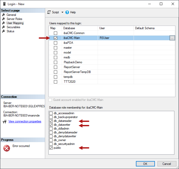 In the upper part of the dialog check the database ibaCMCMain in the Map column. The previously created user name appears automatically in the User column (here RSUser).