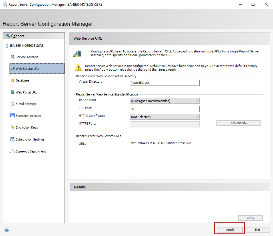 Select Web Service URL in the navigation menu and click on <Apply> to apply the settings. Usually you can keep the default settings. The web service URL is necessary to access the report server.