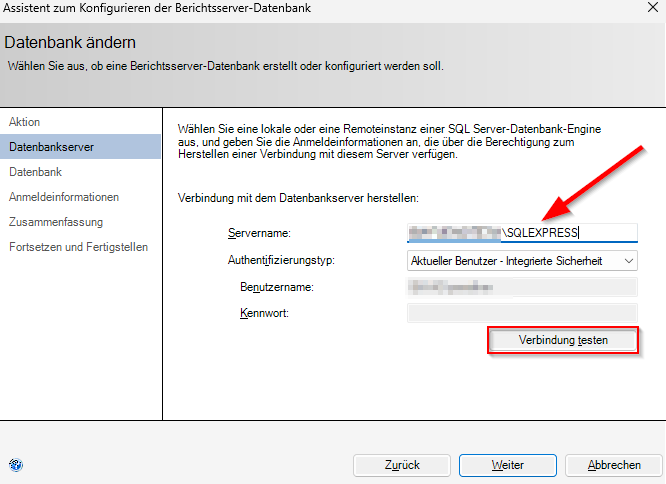 Beachten Sie, dass im Fall von SQL Express Servern noch \SQLEXPRESS and den Servernamen angefügt werden muss.