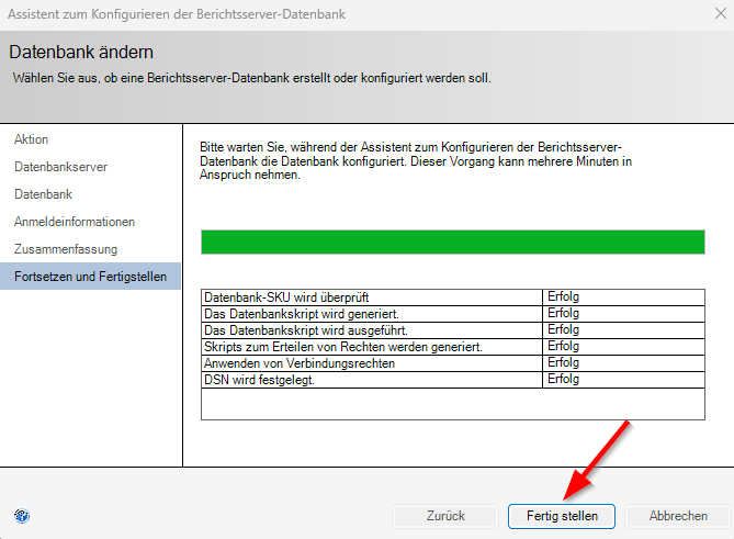 Der automatisierte Prozess legt nun auf dem konfigurierten Datenbank-Server eine Berichtsserver-Datenbank an.