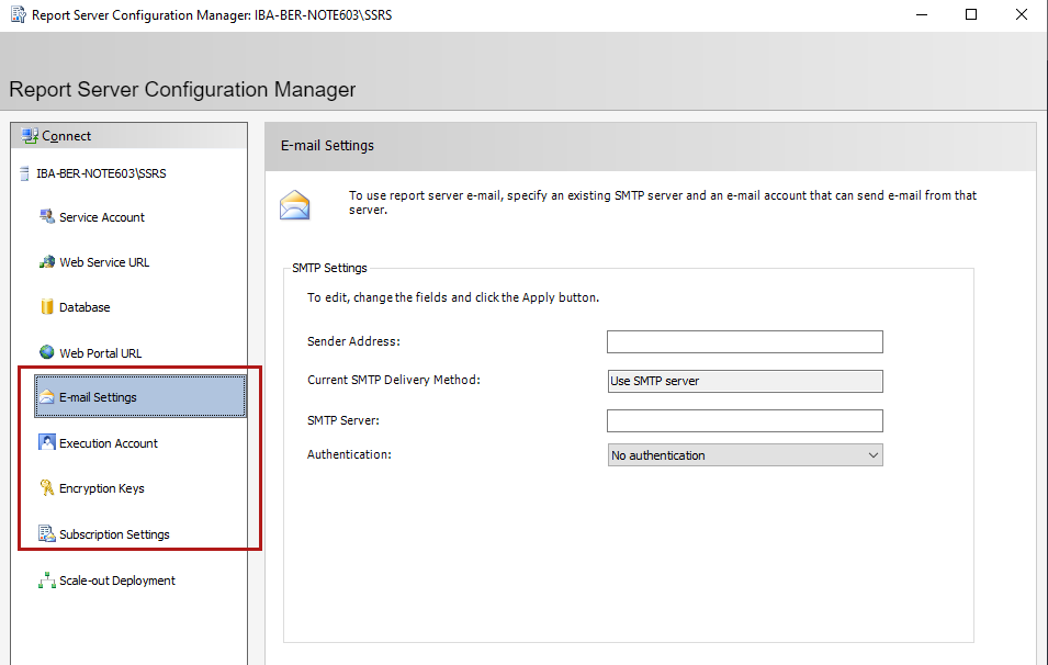 Among the other menu items you may configure e-mails, execution account, encryption keys and subscription settings.