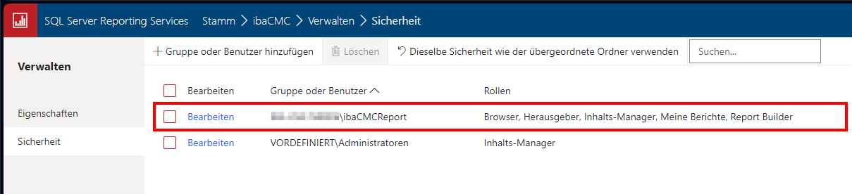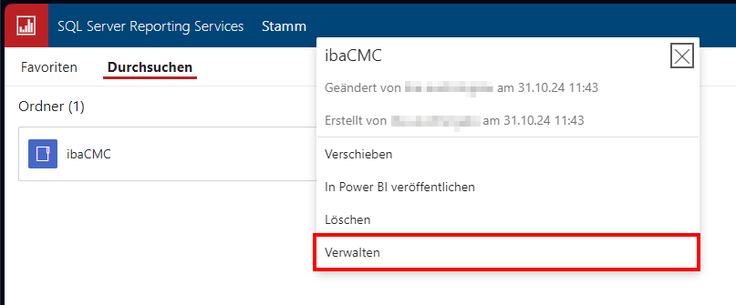 Um die Zugriffsrechte für den ibaCMC-Ordner einzurichten, öffnen Sie das Drei-Punkte-Menü des zuvor angelegten ibaCMC-Ordners, und klicken Sie dann auf Verwalten.
