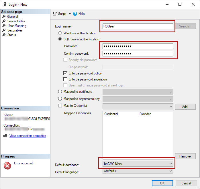 In the dialog Login - New, General page, enter once the username (in this example “RSUser”) and select the authentication method, e. g. the SQL Server authentication with a proper password.