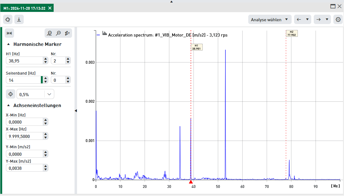 Die FFT-Analyse kann sowohl im FFT-Spektrum der Schwinggeschwindigkeit als auch im FFT-Spektrum der Schwingbeschleunigung durchgeführt werden. In der FFT-Analyse wird die FFT in Ordnungen der Drehzahl angezeigt. Somit repräsentiert die 5.Ordnung bei einer Drehfrequenz von 10 Hz die Frequenz 50 Hz. Somit ist die Ordnungszahl auf der X-Achse immer mit der Drehfrequenz zu multiplizieren, um auf die eigentliche Frequenz zu gelangen.