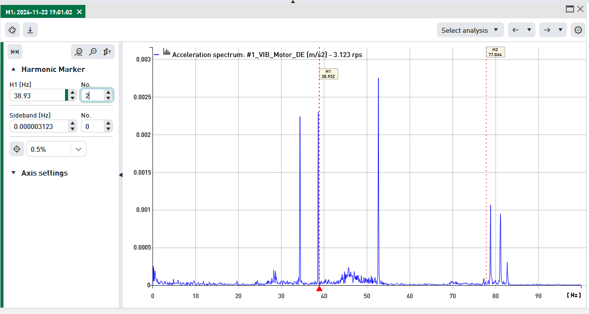 FFT (Fast Fourier Transformation) analysis is a frequently used method of identifying mechanical problems. Diagnosing faults on machine components using FFT is not covered by this document, as it goes significantly beyond the document’s scope. The following figure shows an example of an FFT analysis.