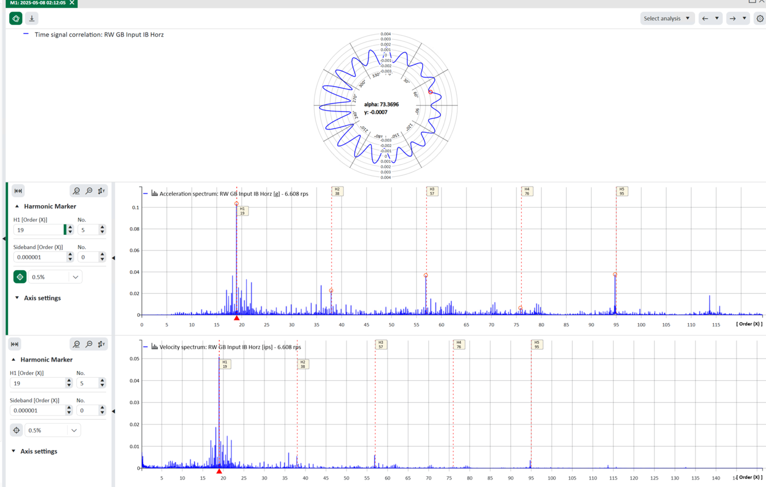 Time signal correlation involves correlating the vibration velocity signal with the shaft speed and representing it as a circle in a chart. This enables periodically occurring damage to be detected and localized. Using the example of a gearbox, each tooth can be identified at the circumference of the circle. Depending on how much energy is behind it, the amplitude either increases or decreases. If there is damage to a tooth and it produces higher vibrations, the amplitude of the tooth increases and we can assume that the relevant tooth is damaged. The following figure shows an example of time signal correlation. The average value of the rotational speed which is stored in the DAT file in the Info channel under RPS will be taken for speed (rps).