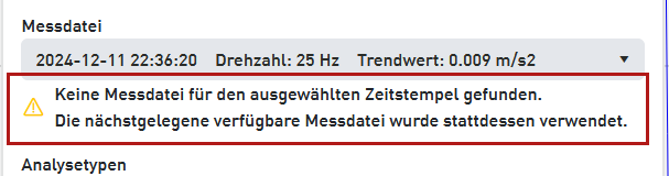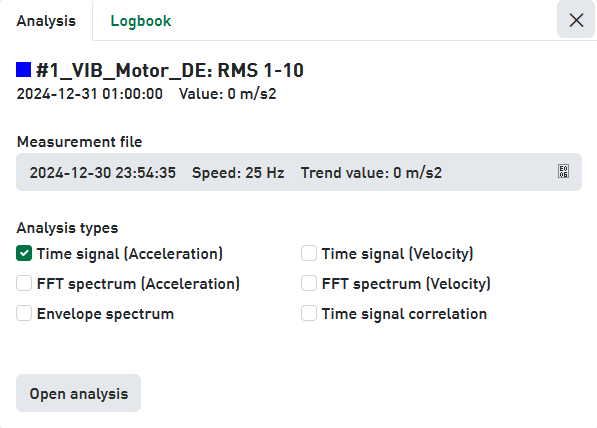 The Analysis type area offers a preselection of suitable analysis types. This preselection is based on the trend type. For instance, the analysis type Time signal (Acceleration) is selected for an RMS trend, because the calculation of the RMS characteristic value is done on the time signal. In case of envelope characteristics, e. g. ENV Inner race, the Time signal (Acceleration)and the Envelope spectrum are preselected. If needed, you can preselect more or other analysis types here. However, you can also select the analysis types later in the signal analysis. Analysis types may be not available (greyed out) and marked with a warning symbol if there is no suitable data .
