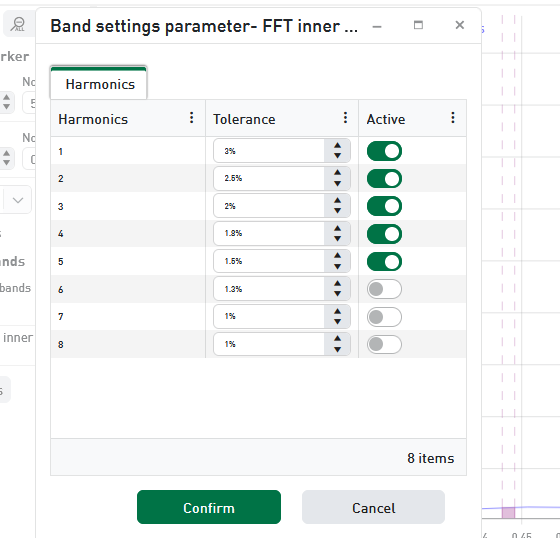 Click the <Band settings> button to open the dialog for configuring the frequency bands for the selected trend. You can adjust and save the band settings directly in the dialog. However, the changes will not take effect until the CMU configuration has been uploaded.