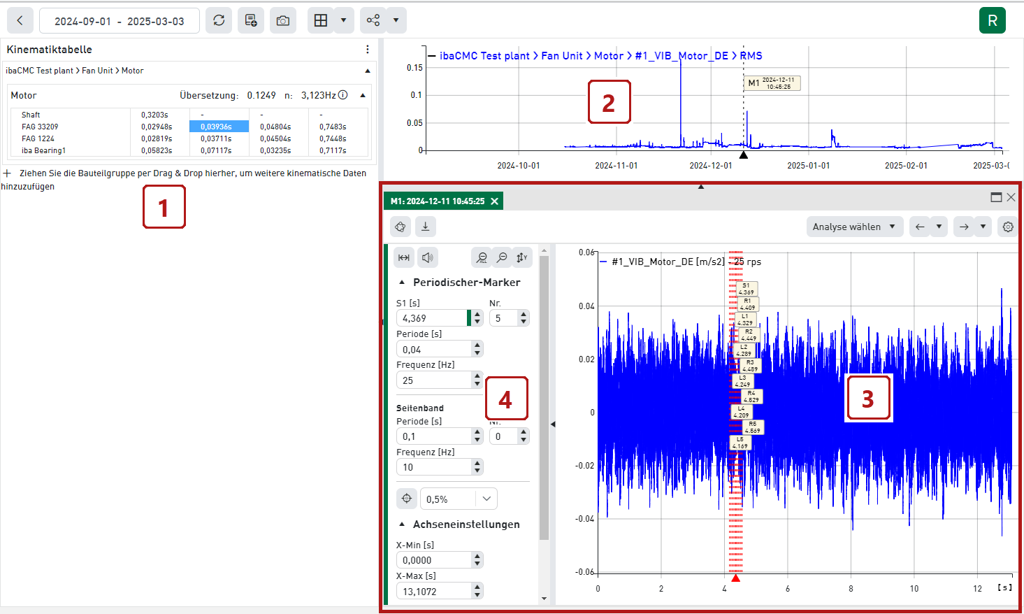 Der rot umrandete Bereich in der Abbildung zeigt eine sog. Kachel mit der Signalanalyse, erkennbar an dem grünen Reiter mit dem Namen der Messdatei. Zum Vergleich unterschiedlicher Zeitpunkte können mehrere Kacheln angelegt und neben- oder untereinander dargestellt werden.